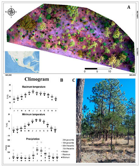 The Mexican Sierra Madre Occidental is known to occupy a special place in forest diversity [14], where different conifer and broadleaf species coexist within a small site. These areas constitute natural laboratories for gathering scientific knowledge regarding dendroecological attributes, including the use of multispectral indices since these can reflect different ecological inter-relationships [15]. For example, the estimation of structural attributes to individual tree levels, such as height and crown area, is of great utility for forest inventories and the determination of biomass and carbon values [3]. For their part, the multispectral indices are indicators of crown vigor, phenology, structural characteristics, defoliation risk and photosynthesis rates, among other variables of forest productivity [16,17]. Monitoring of these variables in complex, unevenly aged and mixed forests can therefore offer new elements for decision-making on the part of forest managers [18], considering that these systems are the greatest reservoirs of carbon and are widely representative of the Mexican forests.