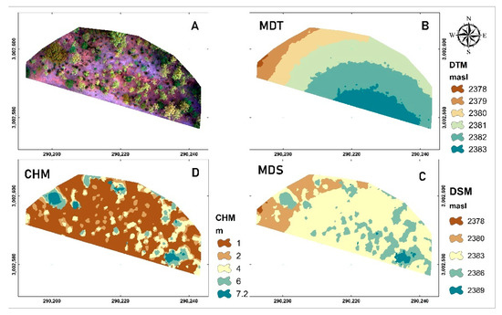 (A) = orthomosaic RGB, (B) = digital terrain model, (C) = digital surface model and (D) = canopy height model, derived from the UAV flight.