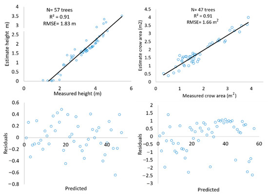 Figure 5 shows the results of the linear regression applied to determine the relationship between the height and crown values recorded in the field and those estimated with the UAV. Furthermore, a graph of dispersion of the residuals of the field data against the predicted values is presented. Statistical evaluations of the characteristics recorded with the field data and those estimated with the UAV showed that 90% of the height and 91% of the crown delineation values are explained by the UAV.