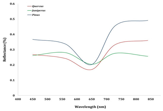 The TVI is sensitive to crown structure [54] and is highly recommended for monitoring changes in the dynamics of the vegetation due to its property of contrasting the values of reflectance [55]. Its values confirmed Quercus as the genus with higher spectral reflectance than the other three genera.