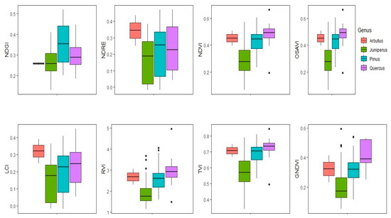 The values of the vegetation indices of the crown were visibly higher (green and yellow colors) than the discriminated indices (herbaceous plant vegetation, bare soil, dead vegetal material—orange and red colors). However, both low and high values were found within the tree crowns. These are hypothetically attributable to different levels of photosynthetic activity, as well as open spaces. Figure 8 shows the distribution range of the maximum values of the vegetation indices per genus, which are commonly associated with seasonal extremes in variations of vegetation dynamics [29].