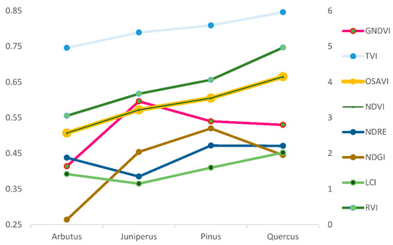 In terms of the distribution of the maximum values of the vegetation indices per genus, Quercus was highest in the indices TVI, NDVI, OSAVI, and LCI (Figure 8 and Figure 9), while Arbutus was highest in NDRE and LCI, and Pinus in NDGI. Juniperus was the lowest across all of the indices (Table 3).