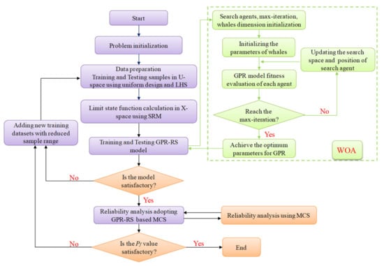 42]. The results demonstrate that with the consideration of the uncertainty of the water table level, the developed model obtains a reasonable probability of failure. At the same time, the application of an iterative algorithm has reduced the number of representative samples selected by the uniform design and consequently improved the accuracy and efficiency of GPR RSM. WOA, which is able to jump out of the local optimum, is adopted to achieve the optimal hyper-parameters for GPR. In conclusion, this dynamic WOA-GPR-based RSM with consideration of the water table level uncertainty, which has not been investigated previously by other researchers, offers an effective way for complicated slope reliability analysis.