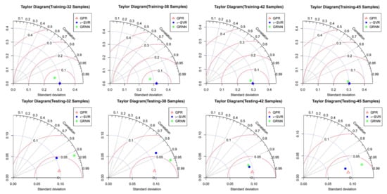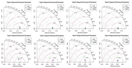 Table 9, it is clear that the presented technique performs better compared to the other two techniques in terms of the indices illustrated in Equation (23) to Equation (29). At the same time, the Taylor diagram, which offers the degree of approximation between the actual and predicted data in terms of standard deviation and their correlation, is also plotted for training and testing datasets as illustrated in