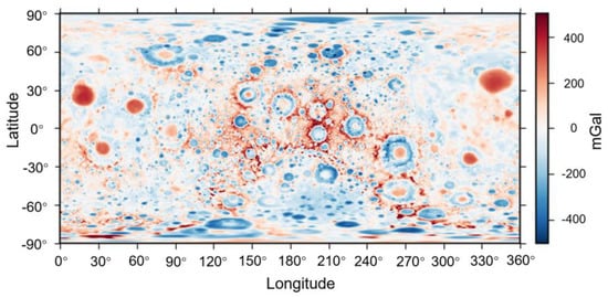 The GRAIL mission was designed to create the most accurate gravitational map of the moon to date [26,27]. It can provide insight into the Moon’s internal structure, composition and evolution when it is combined with topographic data. The published data sets of the GRAIL mission include the radius of the celestial body, the universal gravitational constant, the mass of the celestial body and the series and orders of spherical harmonic model. The gravity anomaly at the specified observed point can be calculated by: