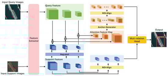 Existing ship detection algorithms [10,11,21,22,23,24] may work unsatisfactorily when lacking training data. Due to great application significance of few-shot ship detection, researchers have conducted extensive research on the problem of less data for training. Many few-shot algorithms are proposed to solve the problem of insufficient training data. Inspired by the few-shot object detection work [25] in computer vision domain, we propose a few-shot multi-class ship detection algorithm with an attention feature map and multi-relation detector (AFMR) for the task of ship detection in remote sensing images. The input of the model are several close-up images of the target and the images to be detected. We call the close-up images support images and the images to be detected query images. Firstly, we obtain feature maps of support images and query images through a weight shared CNN feature extractor. Then, we use the feature vector from the support images to conduct depth-wise convolution on the feature map of the query map to obtain the final feature map. After that, the attention feature map is sent to the module of candidate box generation and the method of generation of the candidate box is the same as YOLO. At last, we compare the feature of the candidate boxes and the feature of support images by multi-relation detector to ascertain the position and the category information of the objects. In short, the contributions of this paper could be summarized as follows.