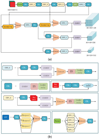 Detailed explanation of the structural information of the feature extractor. (a) roughly describes the structure of the feature extractor and shows the input and the output of the network. The output are three feature maps with different scales. (b) shows the structure of each module in subfigure (a) in detail. In particular, in subfigure (b), the X in CSP1_X represents that there are x residual blocks in the upper half way of CSP1_X and the X in CSP2_X represents that there are CBL in the upper half way of CSP2_X.