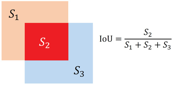 - IoU (Intersection over Union): IOU refers to the ratio of the area of the overlapping part of the prediction box and the ground-truth box to the area occupied by their union. The calculation process of IoU is shown in Figure 7, where represents the area of the orange area, represents the area of the red area, and represents the area of the blue area.