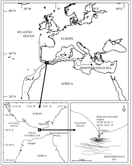 The study was carried out in the spring and autumn of 2006 in the Strait of Gibraltar, one of the hot spots for bird migration in Europe. This bottleneck is the only marine connection between the Atlantic Ocean and the Mediterranean Sea. Thus, the study covers most seabird populations moving in or out of the Mediterranean Sea throughout the annual cycle [28,29].