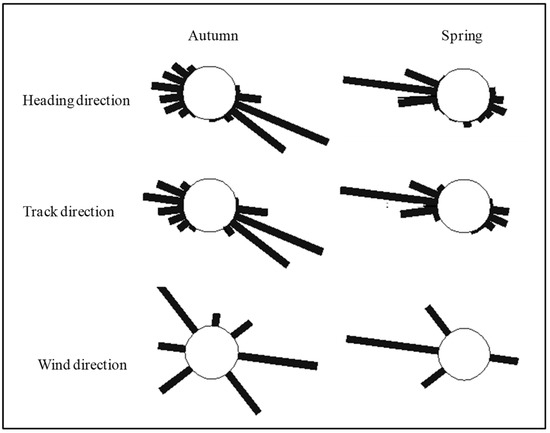 Track and heading distributions of directions were significantly different from random for all the species and in the two seasons (Rayleigh test; all p < 0.001). Track and heading distributions for all species depended on the season, with the expected west–east movement in autumn and east–west in spring (Figure 2). Birds flying west deviated only slightly from the west (271°–277°), whereas birds flying east showed an east–southeast direction (112°–120°) (Table 2).