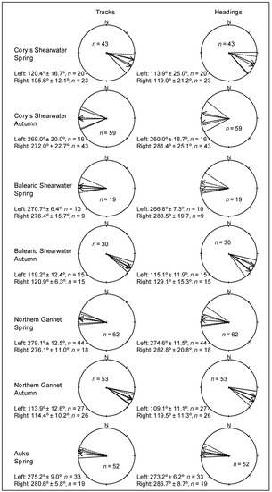 Average track and headings directions, in winds from the left (unbroken bold arrows) and right (broken bold arrows) of the mean direction of each migratory movement. Angular deviations are shown with unbroken lines for flight directions in winds from the left and broken lines for flight directions in winds from the right. n-values given are the total sample sizes and the combined values for both groups together. Mean directions ± angular deviations for each group are given below each panel.