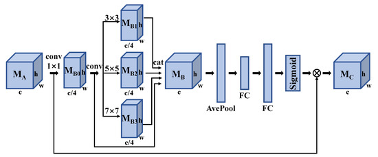 As shown in Figure 3,the input feature map M A R C × H × W is first mapped into M B 0 with the size of C 4 × H × W using 1 × 1 convolution. Second, we conduct three transformations, each consisting of convolution, batch normalization (BN) [54], and ReLU [55], with kernel sizes 3 × 3 , 5 × 5 , and 7 × 7 , respectively. The outputs M B 1 , M B 2 , and M B 3 are C 4 × H × W in size, and they are concatenated together with M B 0 to flow multi-scale information into the next layer. Then, global average pooling aggregates the spatial information into a C × 1 vector, which is then delivered into MLP. Finally, element-wise multiplication is performed between the channel-wise attention vector and the input feature map M A R C × H × W to obtain the multi-scale channel attention feature map M C R C × H × W .