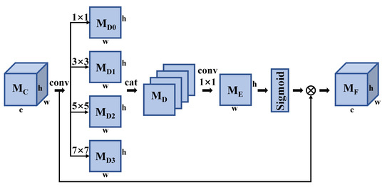 where C o n v k i × k i represents a series of operations of k i × k i convolution, BN, and ReLU. For simplicity, they are collectively called convolution operation. k i = 2 × i + 1 . σ is a sigmoid function used for normalization, and ⨂ indicates element-wise multiplication.