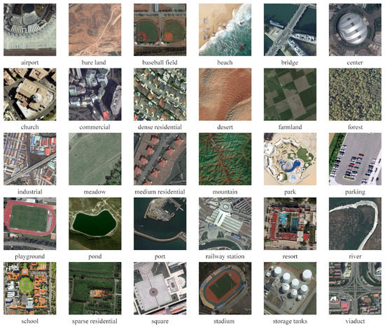 Aerial Image Dataset (AID) [52]: AID dataset includes 10,000 images of 30 classes with spatial resolution from about 8 to 0.5 m. There are 200∼400 images for every category, and each of them is fixed to 600 × 600 pixels. As in [10,11], two dataset partition schemes were applied: 20% and 50% (training set); 80% and 50% (test set). Some samples of AID are shown in Figure 6.