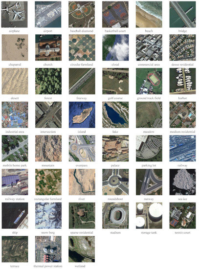 NWPU-RESISC45 [3]: The NWPU-RESISC45 dataset contains 31,500 images covering 45 classes with 700 scene images in each category. These images have 256 × 256 pixels, and the spatial solution varies from about 30 to 0.2 m. We randomly selected 70 (140) images from each category as training images and the other 630 (560) as test images. To date, the NWPU-RESISC45 dataset, as shown in Figure 7, is of the largest in scale, is the most challenging RSISC dataset, and has image variations, high within-class diversity, and high between-class similarity.