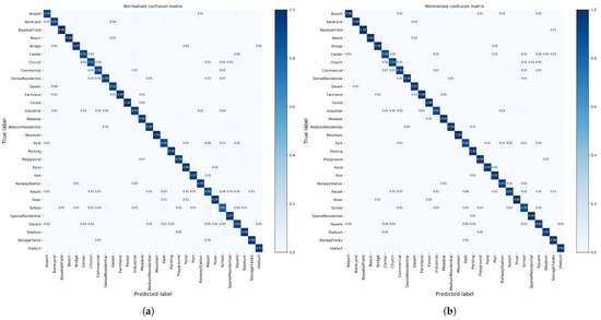 Figure 9. CMs on AID. (a) Training ratio = 20% (accuracy = 95.14%). (b) Training ratio = 50% (accuracy = 96.70%).