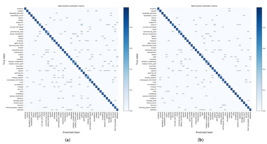 Figure 10. CMs on the NWPU-RESISC45 dataset. (a) Training ratio = 10% (accuracy = 92.44%). (b) Training ratio = 20% (accuracy = 94.70%).
