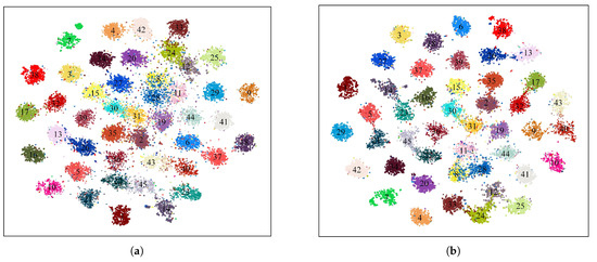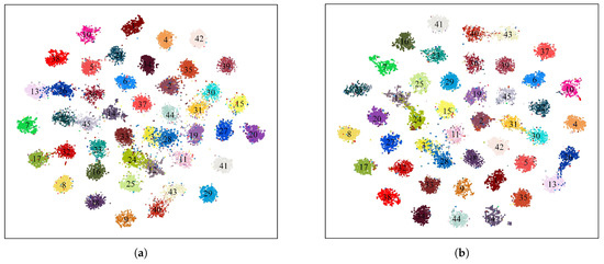 Figure 13. Two-dimensional scatterplots of high-dimensional features on the NWPU-RESISC45 dataset (training ratio = 20%). (a) ResNet50 backbone. (b) The proposed TMGAM.