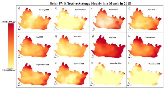 Solar PV effective average hourly in a month in 2018 ((a) January, (b) February, (c) March, (d) April, (e) May, (f) June, (g) July, (h) August, (i) September, (j) October, (k) November, (l) December).