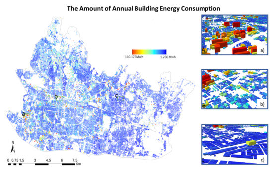 The amount of annual building energy consumption (Selected area of 3D building consumption in: (a) Bandung Kulon District, (b) Coblong District, (c) Arcamanik District).
