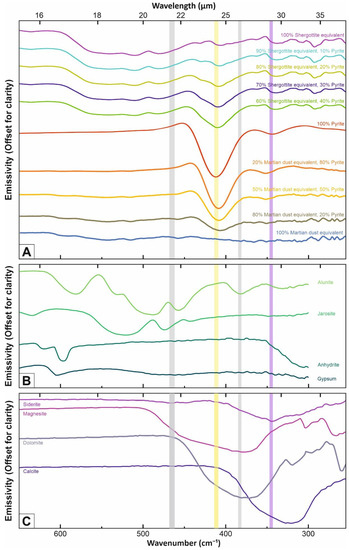- Chihara, H.; Koike, C. Infrared absorption spectra of plagioclase feldspar: Dependencies of composition and temperature. Planet. Space Sci. 2017, 149, 94–99. [Google Scholar] [CrossRef]