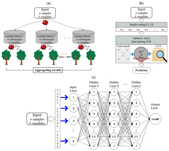 Schematic diagrams of the (a) RF, where n = samples, m = subsamples, m << n, k = variables, ntree = 500, and mtry = k/3; (b) SVR, where input data are rescaled to the range of [−1, 1], the RBF represents the radial basis function kernel, c and g are the parameters of the RBF, and 5-CV denotes 5-fold cross-validation; and (c) ANN, where i and j are the numbers of neurons and hidden layers, respectively.