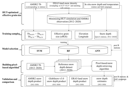 The workflow of this study is shown in Figure 3. The first step is to optimize the effective grain size using HUT simulation and AMSR2 observation. Our previous study demonstrated that RF performance was greatly improved when effGS was involved in the training of predictor variables [30]. The effGS variable, as the most important predictor variable, was optimized by utilizing the HUT model by minimizing the difference between AMSR2 observations and HUT simulations at 18.7 and 36.5 GHz. The optimization procedure of effGS (ranging from 0 to 4 mm, with a step size of 0.01 mm) is described as follows: