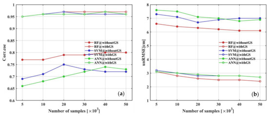 Trends of (a) corr.coe and (b) unRMSE with increasing training sample size for the three ML models.