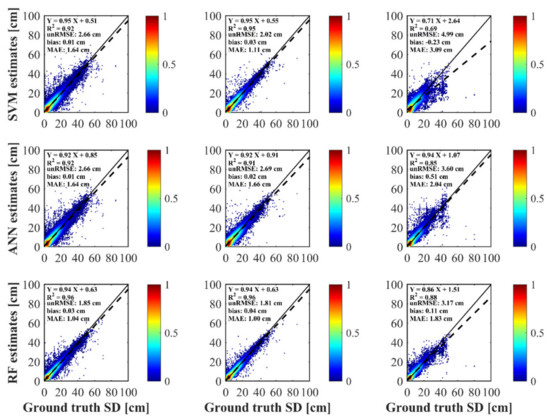 Based on the analysis in Section 3.1, the number of training samples was set to 30,000, which is large enough to ensure that the ML model performs stably and to make the cross-comparison much more objective. Figure 5 shows the validation of the SVR, ANN and RF algorithms with sample-, temporal-, and spatial-based 10-CV approaches. This demonstrates that these three ML algorithms perform similarly in snow depth retrieval, which is attributed to the inclusion of effGS in training samples (Figure 3). The effGS variable records the spatial–temporal variation in snow metamorphism and makes the ML model robust and stable.