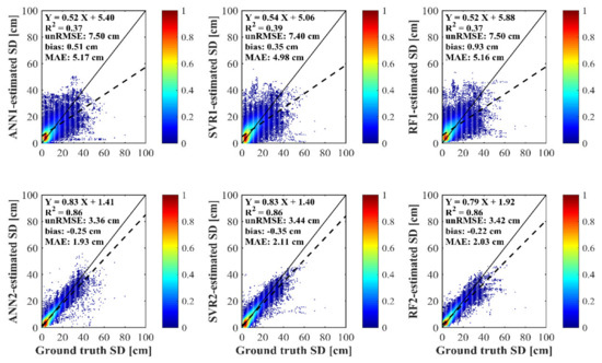 The ML-based estimates were further verified with spatially independent station measurements from part B stations, whereas the ML retrieval models were trained with measurements from part A stations (Figure 1). Figure 6 shows the validation and comparison results. Here, ANN1, SVR1, and RF1 represent the trained ML model without considering effGS, while ANN2, SVR2, and RF2 consider effGS. This result demonstrates that the ANN2-, SVR2-, and RF2-based estimates were in good agreement with the station observations, with a high R2 of 0.86 and a low unRMSE of approximately 3.4 cm. However, ANN1, SVR1, and RF1 present poor performances, with an unRMSE of up to 7.5 cm. Thus, the inclusion of effGS in predictor variables enhanced the predictive power of the ML models (Figure 4, Figure 5 and Figure 6). In this study, the RF model was selected to retrieve the snow depth reference dataset for building a pixel-based retrieval algorithm due to its high computational efficiency relative to the computational efficiencies of the SVR and ANN methods.