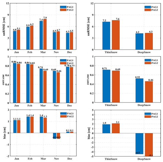 Validation and comparison of PAG1 and PAG2 algorithms during the winter period (January, February, March, November, and December) and snowpack conditions (thin snow (<20 cm) and deep snow (>20 cm)).