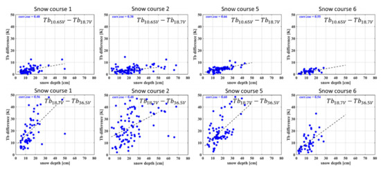 Generally, the 10.65 GHz channel plays a significant role in snow depth estimation globally, but it is inapparent in China. Figure 9 shows the relationship between AMSR2-observed Tb gradients and field-measured snow depth data along four snow courses (see Figure 1). Apparently, both (Tb10.65V − Tb18.7V) and (Tb18.7V − Tb36.5V) present an increase with increasing snow depth. However, (Tb18.7V − Tb36.5V) is more sensitive to snow depth than (Tb10.65V − Tb18.7V); that is, the small dynamic range of (Tb10.65V − Tb18.7V) for snow depths is from 0 to 70 cm. Snow cover is generally shallow over China’s flat areas; thus, both 10.65 GHz and 18.7 GHz channels can penetrate snow and achieve microwave emission of soil beneath snowpack. Although the snow cover over mountains is deep, the effects of the topography and mixed pixels disturb the relationship of the Tb gradient and snow depth. For example, snow course 2 is located in the Tien Shan Mountains. As illustrated in Figure 9, the relationship between the Tb gradient and snow depth is poor. Although the point-based measured snow depth is as high as 50–70 cm, the averaged snow depth in a pixel (0.25° × 0.25°) is unknown; that is, there is a poor representativeness of so-called true data.
