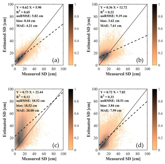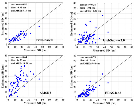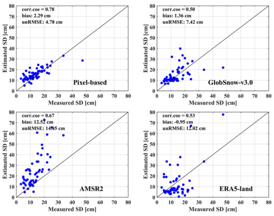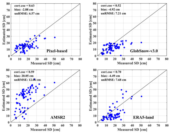 Evaluation and comparison of snow depth estimates from (a) the pixel-based algorithm, (b) GlobSnow-v3.0, (c) AMSR2, and (d) ERA5-land using part B station measurements.