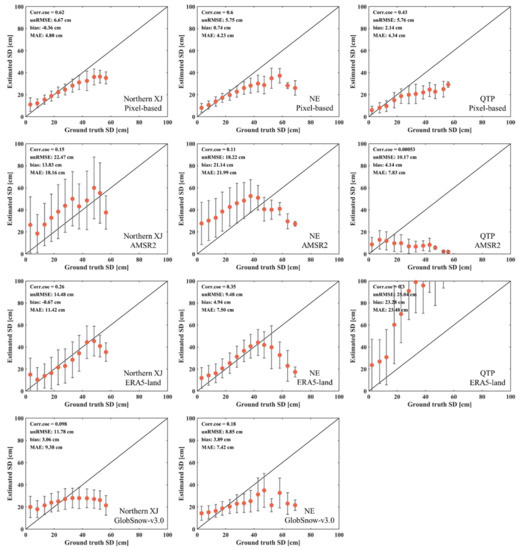 Figure 11 shows the comparison and validation results of the pixel-based algorithm, AMSR2, GlobSnow-v3.0, and ERA5-land products in three stable snow cover areas (Northeast China, northern Xinjiang and the QTP) across China. The pixel-based algorithm outperforms the other three products in any snow cover area. The AMSR2 estimates tend to be higher than the station measurements in northern Xinjiang, with a bias of 13.83 cm. Additionally, the AMSR2 product presents a large uncertainty, with a high unRMSE of 22.47 cm. The ERA5-land product also presents a high error (unRMSE: 14.48 cm) in northern Xinjiang, but the averaged estimates tend to be close to the station measurements. Although the unRMSE of GlobSnow-v3.0 is 11.78 cm, the relationship between the estimates and station measurements is poor. In Northeast China, the AMSR2 and ERA5-land products present an overestimation for snow depths less than 50 cm, especially for AMSR2, with the highest bias of 21.14 cm. The pixel-based algorithm is superior to AMSR2 and ERA5-land products on the QTP. However, it tends to underestimate snow depth for conditions greater than 20 cm.