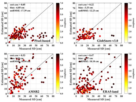The proposed pixel-based algorithm outperforms the other three products in flat and stable snow cover areas (Figure 12, Figure 13 and Figure 14). However, deriving snow depth in mountains remains a challenge for space-borne PM remote sensing. Figure 15 shows the validation and comparison of snow depth estimates retrieved from the pixel-based algorithm and GlobSnow-v3.0, AMSR2, and ERA5-land products in the Tien Shan Mountains. Note that GlobSnow-v3.0′s sample size is smaller than that of the other three products because of its mountain mask. Here, the roughness of topography was calculated as the logarithm of the elevation’s standard deviation within a 0.25° × 0.25° pixel, that is, roughness = loge(Stdev), with darker colors indicating more undulant terrain. Figure 15 shows that these four methods consistently present poor performance. The pixel-based algorithm tends to underestimate snow depth for deep snow conditions (>40 cm) where the roughness of terrain is high. AMSR2 and ERA5-land products can reflect deep snow, with large unRMSE values of 18.94 cm and 18.10 cm, respectively. GlobSnow-v3.0 estimates perform best among the four products, with an unRMSE value of 12.23 cm. However, some samples with unusually deep snow conditions are filtered out due to mountain masks.