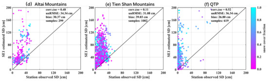 Figure 17 shows the snow depth spatial distribution of the SE1 product and pixel-based estimates. Figure 17a shows the initial SE1 product at a 0.01° × 0.01° scale. Figure 17b shows the linearly resampled SE1 product at a 0.25° × 0.25° scale. The SCF was determined by the number of initial SE1 pixels in a 0.25° × 0.25° grid. Figure 17c shows the pixel-based estimates at a 0.25° × 0.25° scale. We also compared the results of SE1 estimates and station measurements in three complex mountains (Altai Mountains, Tien Shan Mountains, and QTP) over China (Figure 17d–f). Figure 17d–f shows that the SE1 estimates are much higher than the station observations, even in areas where the SCF approximately reaches 100%, indicating that snow thickness presents strong heterogeneity in a 0.25° × 0.25° pixel due to the complex topography.