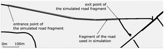 The speed limit assigned to this road fragment is 90 km/h. The traffic volume values utilized as input parameters for the simulations are based on data obtained from the test installation. Traffic measurement using a specially constructed data acquisition module from an intelligent road sign lasted 128 days (in the spring and summer seasons, between May and September). Based on the analysis of the collected data, average traffic volume values were obtained by averaging out the influence of the time of day, weather conditions, and other factors, such as the day of the week or impact of random events. The use of simulation, instead of a real-life experiment, allowed us to test multiple possible scenarios of system application, as well as to estimate its performance for various road traffic types. More details regarding the testing scenarios are provided in the subsequent part of the manuscript. Outcomes of simulations were used to evaluate the anticipated influence of the proposed system on the traffic parameters in the place of its application. Values of typical traffic intensity and statistical parameters, such as mean time between events of a vehicle entering, were derived from the measurement of those parameters in the real world. Additionally, the percentage of vehicle classes, i.e., trucks, cars, and motorcycles, were estimated based on measurement results. This information was used for selecting test cases, as well as for the calibration of the Krauss model to reflect the intensity and structure of vehicle classes observed in the real-world measurement place. The length of the road fragment used to design the simulation environment was approximately 2.5 km. The visualization of road fragment geometry used for the simulation is shown in Figure 1.