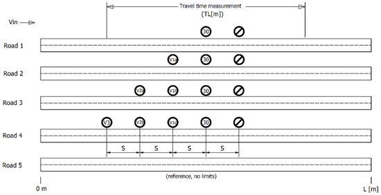 The experiments used the model shown in Figure 2. This model consists of five road sections of identical length, differing in the number of variable message signs installed. Road number 5 does not contain any speed limits (within the allowed range, defined at the beginning of all sections) and is the reference section.