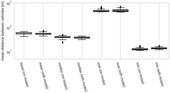 Simulations related to the recommended traffic speed were conducted for two cases. In the first one, the system for calculating and enforcing the recommended speed was turned off, and combinations of the three previously mentioned vehicle traffic volumes and response times were tested. Then, the same situations were analyzed, but with the system turned on. The output of the simulation was a set of statistical descriptors reflecting the distance between vehicles in each simulated scenario. The minimal, maximal, median, and mean value of the distance between the vehicles was collected. Such a set of parameters was obtained for each of the 40 repetitions of the simulations. Each repetition contained a traffic example, which was affected by the proposed system for the automatic control of the speed limit, as well as an example of a situation in which the system was turned off. Therefore, it was possible to calculate the change in the statistical properties of the distance between the vehicles for each considered case.