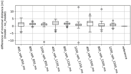 Boxplot visualization illustrates increase in the vehicles’ minimal distance for each simulation scenario.