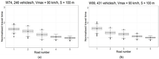 The simulations were conducted for four technical classes of roads, as specified in the national regulations in Poland. These classes differ in traffic intensity and allowed speeds. The results of the measurements of travel times of the test sections were normalized, concerning the average value obtained for road No. 5 (reference road), on which the traffic took place without any obstacles. Depending on the tested road class, two models of drivers’ behavior were used in the simulation: Wiedemann 74 [51] and Wiedemann 99 [52]. Under normal traffic conditions, the maximum deceleration is assumed to be 3.2 m/s2 to 3.5 m/s2 [53], and this was assumed in the simulation. The maximum deceleration for emergency braking is approximately 1 g, i.e., 9.81 m/s2 [54].