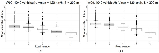 The most orderly situation can be seen in Figure 5a. Low traffic volumes and relatively slow speeds caused the measurement points to line up regularly. An increase in traffic volume to 431 vehicles per hour, while maintaining the speed (Figure 5b, i.e., 90 km/h), did not cause significant changes. However, the first signs of disturbance on road No. 1 can be observed, which manifested in an increased number of outliers. Doubling the traffic volume and increasing the speed to 120 km/h, as in Figure 5c,d, caused an apparent increase in the number of vehicles, for which the travel time was significantly longer. The formation of queues manifests this. Comparing Figure 5c,d, it can also be seen that increasing the distance between traffic signs resulted in a clear increase in travel time.