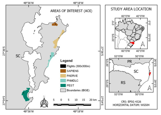 Four areas of interest (Figure 1) were selected for the study, all in the Greater Florianópolis region, containing portions of the ecosystem pioneer formations—vegetation with marine influence, according to the Brazilian Institute of Geography and Statistics (IBGE) [35], also known as restinga areas.
