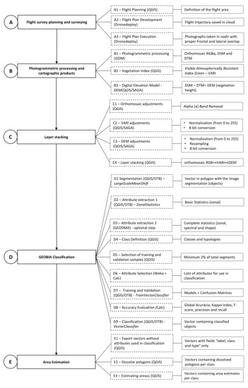 This methodological flowchart (Figure 2) displays the main steps covering the complete cycle, from the preparatory step for field data acquisition to the post-processing steps involving cartographic product assembly, layer stacking, segmentation, GEOBIA classification, and area estimation.