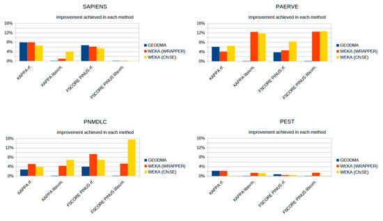 The estimated accuracy was calculated for all the performed classifications. By default, the OTB TrainVectorClassifier algorithm provides precision, recall, and F-score for each class and overall classification performance by the kappa index. The obtained classification only with the features calculated by OTB was adopted as a reference to estimate the improvement obtained from the dataset increment with the features calculated by GeoDMA, as well as with successive rounds of attribute selection using Weka. Thus, a baseline was established to estimate the improving classification in relation to the OTB.
