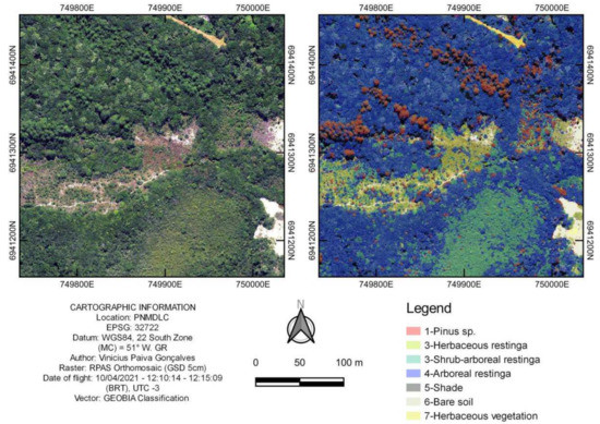 Segmentation example in the PNMDLC area in comparison to visual reference proposed by Liau [46]. CRS: EPSG 32722. Horizontal datum WGS84, UTM projection system, 22 South Zone. MC 51°W. GR. Raster: RPAS orthomosaic (GSD 5 cm). Flight date: 10/04/2021, 12:10:14–12:15:09 Brasilia Time (BRT), UTC-3.