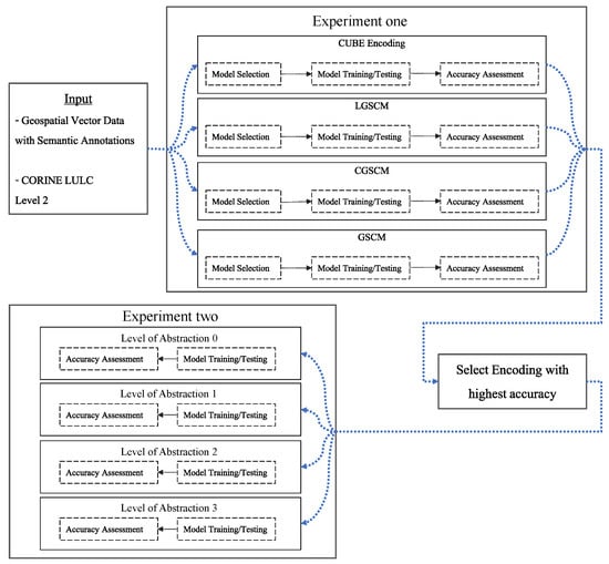 A graphical overview of the methodology can be seen in Figure 1. There are two major sections within the methodology: Experiment one and Experiment two. Two different input files were used for the workflow. The first input data set is geospatial vector data from LinkedGeoData (http://linkedgeodata.org/, accessed on 5 October 2021) which describes the geometries and geo-object types (e.g., a polygon describing a Shop or a linestring describing a way). The second data set is CORINE LULC Level 2 data from Copernicus (https://land.copernicus.eu/pan-european/corine-land-cover, accessed on 4 October 2021), which is used as ground truth similar to other work [,,,,]. Both datasets were obtained for the year 2018. In Experiment one, which was carried out before Experiment two, four different encodings were created for the training and testing samples locations. These encodings transform the geospatial vector data and their semantics in different ways.
