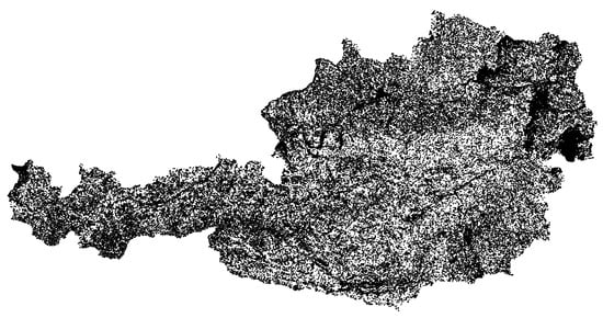 The two datasets were obtained for the entire ROI of this work, which is Austria (the ROI and sample locations are depicted in Figure 2). CORINE Level 2 for the year 2018 was used as ground truth (see Figure 3) as it is a well-studied LULC dataset used by others as ground truth as well [,,,,]. The task within both experiments was to predict the LULC classes provided by CORINE. There are 13 different LULC classes within the ROI (see Table 1). A total of 2 of the 15 originally available LULC were not available in the ROI, as Austria is landlocked (LULC classes Marine Waters and Coastal Wetlands are missing). Some 12,000 LULC grid-cells were randomly selected for each LULC class which were then used in Experiment one and Experiment two for training and testing the classification model. Each of these grid-cells (of size 100 m × 100 m) defines the area and ground truth (the LULC class) for a single sample. An equal number of CORINE grid-cells was selected for each LULC class to have a balanced representation of the LULC in the training and testing dataset for subsequent deep learning in our workflow. The geographic distribution of these samples can be seen in Figure 2. For each of these samples, geospatial vector data was extracted around the sample center location. This vector data and its semantics were then ultimately used to predict the LULC class of the corresponding sample. The geospatial vector data was obtained from LinkedGeoData [], which derives its data from OSM and enhances the object description with an ontology. This enables the description of a single geo-object in terms of multiple Web Ontology Language (OWL) classes which exhibit defined super- and sub-class relationships to each other. For example, a geo-object might be of type PetShop; however, given the ontology, it automatically is also of type Shop and Amenity. This is because the ontology defines PetShop as a subclass of Shop, and Shop as a sub-class of Amenity. Each geo-object is additionally characterized by a geometry which can either be a point (e.g., for the location of a Street sign), a linestring (e.g., for the course of a Street), or a polygon (e.g., for the footprint of a Building).