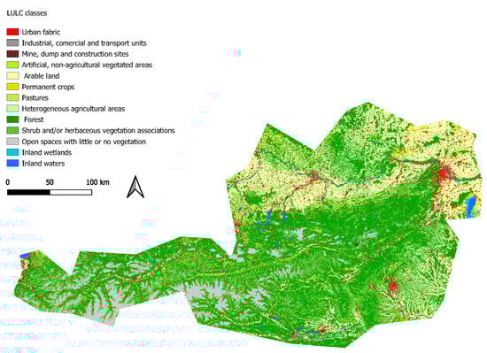 The 13 different LULC available in the ROI (Austria). A total of 2 of the original 15 CORINE LULC Level 2 classes were not available as the ROI (Austria) is land-locked. These were Coastal wetlands and Marine waters.