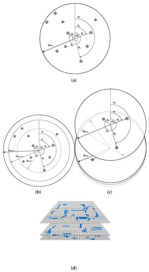 The four encodings presented in this work. All of them quantify the geospatial vector data differently: (a) shows the GSCM which was introduced by [] (image source: []); (b) shows the layered GSCM (LGSCM) which computes descriptive statistics for different ring regions. For each ring region descriptive values are computed for each OWL class; (c) shows the channel GSCM (CGSCM) which provides a channel-wise representation of the descriptive values. In (a–c) the different geo-object types (OWL classes) are indicated by different shapes; (d) shows the CUBE encoding which represents the geographic distribution of each geo-object type as a heatmap. In this visualization, only three of multiple heatmaps are shown. Each heatmap represents the geospatial distribution of a specific OWL class. Here, deep blue grid-cells denote a higher number of geo-objects, whereas the color gradient toward white represents a decreasing number of geo-objects.